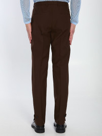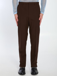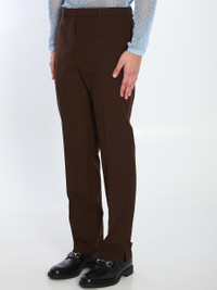 Trousers in dark brown wool twill. They feature a hook, button, and zip closure, belt loops, two side pockets, two back welt pockets with an embossed Gucci logo on the right, and side vents at the hem with buttons. The model is 187cm tall and wears a size IT 48. Size nationality: IT Gender: Men Material: EXT: 100% WOOL; INT: 100% VISCOSE; DETAIL: COTTON Color: BROWN Made in: IT Product ID: 32390196 820913 Z7AL1 2129 *Import tax/duty will be calculated at checkout (If applicable)