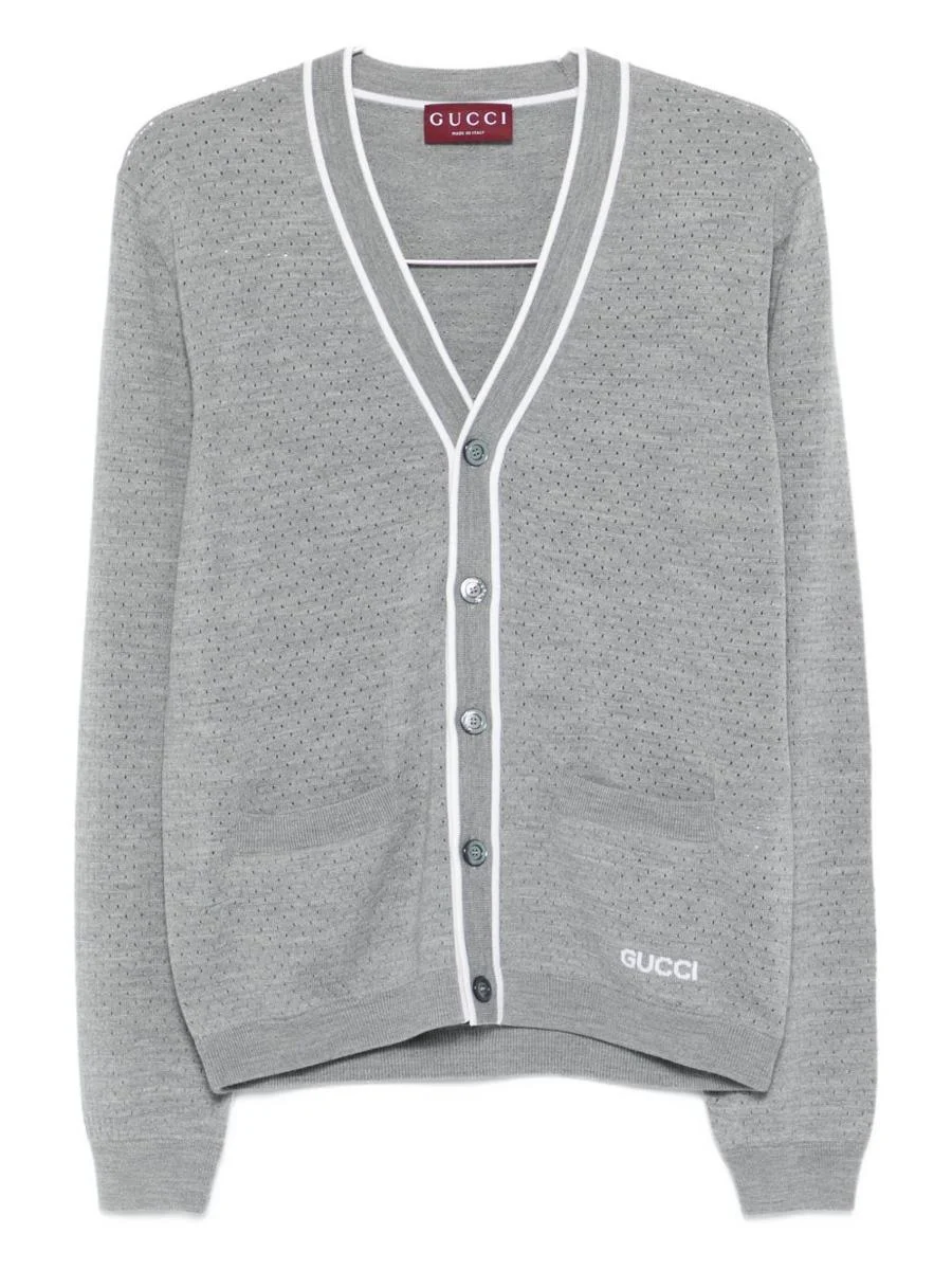 grey wool button fastening v-neck white trim embroidered logo Gender: Men Material: WOOL 100% Color: GREY Made in: Italy Product ID: 834072XKESP1130 *Import tax/duty will be calculated at checkout (If applicable)