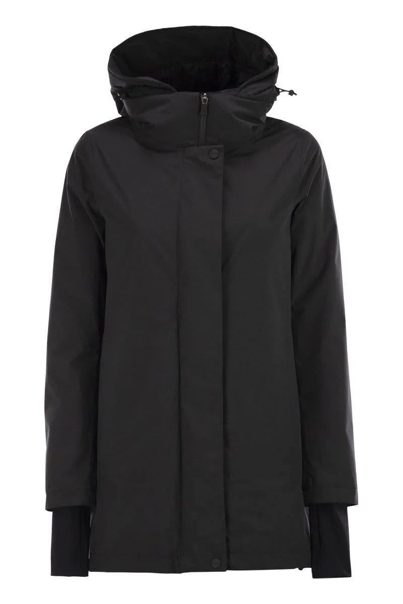 A-shape in polyester microfibre coupled with a high-performance membrane that offers breathability and resistance up to 20,000 water columns. Herno heritage and modern functionality come together in this cosy garment, designed as a luxurious update to the wardrobe dedicated to travel and outdoor activities. - Regular fit - Down padding - Hood and drawstring - Knitted cuffs with thumb holes - Side welt pockets - Double-slider zip closure and press studs - Performance: Water-repellent treatment DESIGNER ID: PI002078D12840 9300 Gender: Women Material: 100% POLYESTER MEMBRANE: POLYURETHANE LINING: 100% POLYAMIDE TRIMMING: 75% POLYAMIDE, 25% ELASTANE PADDING GOOSE DOWN CLASS 1: 80% DOWN, 20% WATERFOWL FEATHER Color: Black Made in: Imported Product ID: PI002078D12840 9300 *Import tax/duty will be calculated at checkout (If applicable)