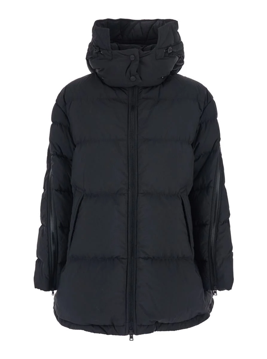 Down jacket Black Removable drawstring hood Long sleeves Front zip closure Two front welt pockets Straight hem Down filled and quilted Tech fabric Regular fit Gender: Women Color: Black Made in: Imported Product ID: PI002097D126269300 *Import tax/duty will be calculated at checkout (If applicable)