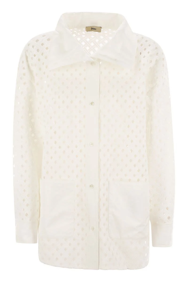 Shirt-cut jacket in perforated crochet-effect lace with a feminine flair. Light and sophisticated, the garment adds a fresh note to the leisure wardrobe and is enriched with a collar and pockets in taffeta with water-repellent yarn treatment. The fabric has a slightly iridescent finish with a sporty yet elegant appeal. - Relaxed fit - Maxi shirt collar - Long sleeves - Button cuffs - Pockets on the sides - Button closure - Made in Italy - Performance: Water-repellent treatment DESIGNER ID: GC000481D12702 1000 Gender: Women Material: 100% POLYESTER Color: WHITE Made in: IT Product ID: GC000481D12702 1000 *Import tax/duty will be calculated at checkout (If applicable)