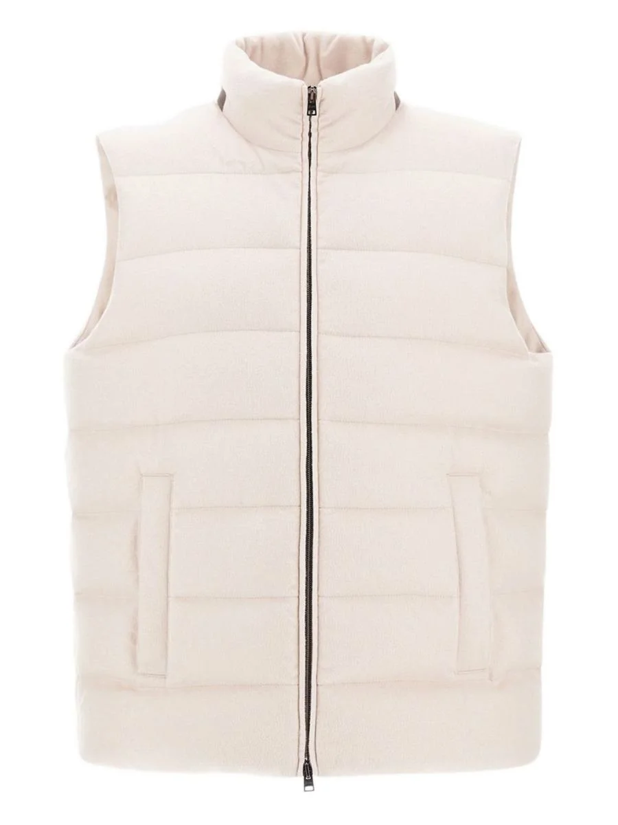 Front double-slider zip closure Stand collar, metal plate at back; sleeveless Side welt pockets Monogram details Lined; 90/10 goose down and feather padding Striped quilting Eco-friendly water-repellent treatment (PFC-free) Regular fit Chantilly color 51% Silk, 49% Cashmere Made in Italy Gender: Men Material: 51% SILK, 49% CASHMERE Color: Beige Made in: Italy Product ID: PI001282U380871985 *Import tax/duty will be calculated at checkout (If applicable)