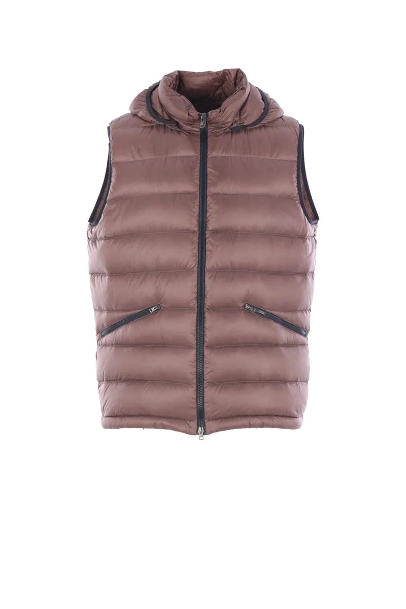 Herno sleeveless down jacket made of ultralight brown nylon. Featuring a high collar, removable hood, double-slider front zip closure, zip pockets, and a straight hem with drawstring. The design is completed by a metal logo plate applied on the hood. Gender: Men Material: MAIN FABRIC: 100% POLYAMIDE MAIN LINING: 100% POLYAMIDE GASKET: 85% POLYAMIDE 15% ELASTANE PADDING (FEATHER): 90% DOWN FILLED COMFORTER 10% FEATHER Color: Brown Made in: Romania Product ID: PI001300U12020Z8040 *Import tax/duty will be calculated at checkout (If applicable)