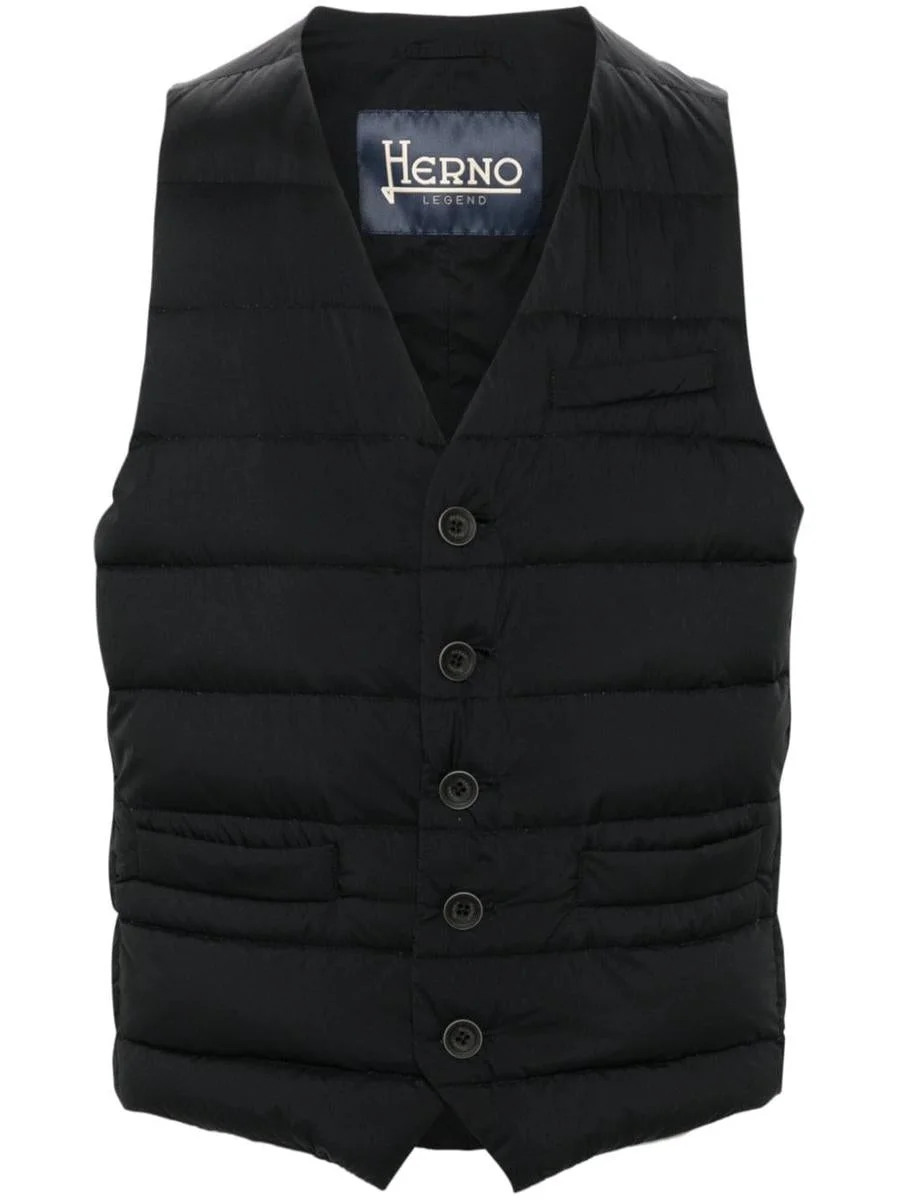 black goose down insulated design padded design quilted V-neck sleeveless chest welt pocket two front welt pockets adjustable side straps straight hem full lining front button fastening Gender: Men Material: POLYAMIDE 100% Color: Black Made in: Italy Product ID: PI002ULE12456Z9300 *Import tax/duty will be calculated at checkout (If applicable)