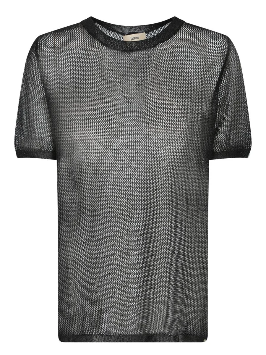 Soft short-sleeve knit with round neckline detail in black lurex. Fine mesh with slim hem. This Herno knit combines elegance and modern comfort, perfect for an evening look. The black lurex texture adds a touch of luxury while maintaining a sober and refined profile. Gender: Women Material: 80% VISCOSE 20% METAL Color: Black Made in: Imported Product ID: MG000173D 76070 9300 *Import tax/duty will be calculated at checkout (If applicable)
