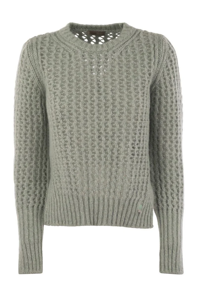 Knitted in an alpaca and wool yarn with openwork stitch work. The pattern combines soft textures and unexpected graphic touches that sculpt the essentiality of the lines and explore a new formula of elegance. - Regular fit - Openwork stitch work - Fineness 3 - Round neck - Long sleeves - Side slits - Metal Herno logo on the back - Ribbed finished edges DESIGNER ID: MG00020DR70198 7103 Gender: Women Material: 48% ALPACA, 23% METAL, 21% POLYAMIDE, 8% WOOL FINISHES: 55% COTTON, 45% POLYESTER Color: WATER GREEN Made in: MD Product ID: MG00020DR70198 7103 *Import tax/duty will be calculated at checkout (If applicable)