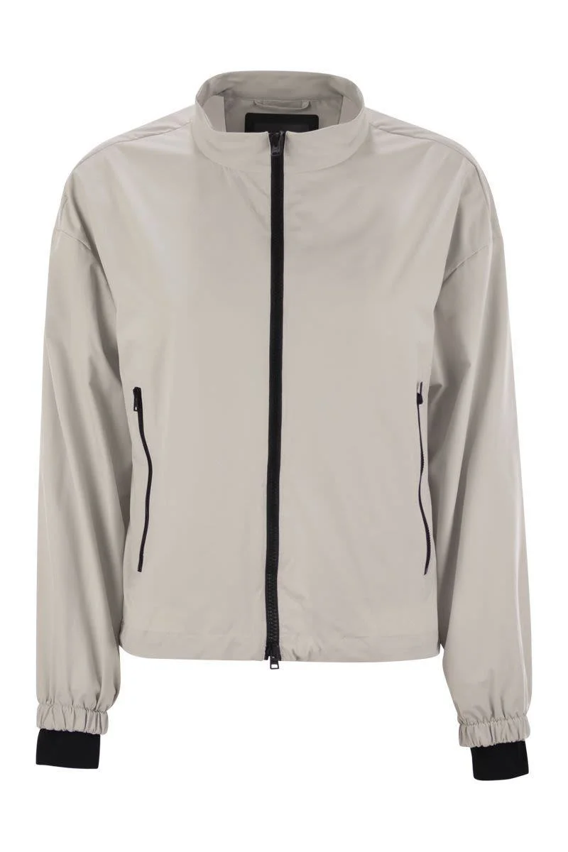 Bomber jacket with a 2 layer Gore-Tex construction in lightweight 30 denier plain stretch nylon with a fine hand feel. Essential in design and innovative in its attention to detail, the model has a smart attitude that guarantees protection against water and wind. It features a boxy fit and double-slider fastening to modulate the fit. - Boxy fit - Long sleeves - Elasticated cuffs - Double-slider zip fastening - Performance: Water-repellent, windproof, breathable DESIGNER ID: GI000288D12503Z 1250 Gender: Women Material: 100% POLYESTER TRIMMING: 75% POLYAMIDE, 25% ELASTANE Color: ICE Made in: RO Product ID: GI000288D12503Z 1250 *Import tax/duty will be calculated at checkout (If applicable)