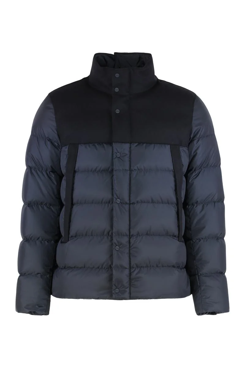 Lightweight quilted nylon jacket This down jacket features a bicolor design with a black upper section and a dark blue lower part. It has a high collar for greater protection against the cold and long sleeves. The jacket is made of lightweight yet warm material, ideal for tackling low temperatures. The horizontal seams contribute to a modern and sporty look. Perfect for outdoor activities or everyday use, it offers comfort and style. Padding: 80% down, 20% feather. 100% Polyamide, 80% Virgin wool, 20% Polyamide Gender: Men Material: POLYAMIDE Color: BLUE Made in: Romania Product ID: PI001251U12004Z_9200 *Import tax/duty will be calculated at checkout (If applicable)