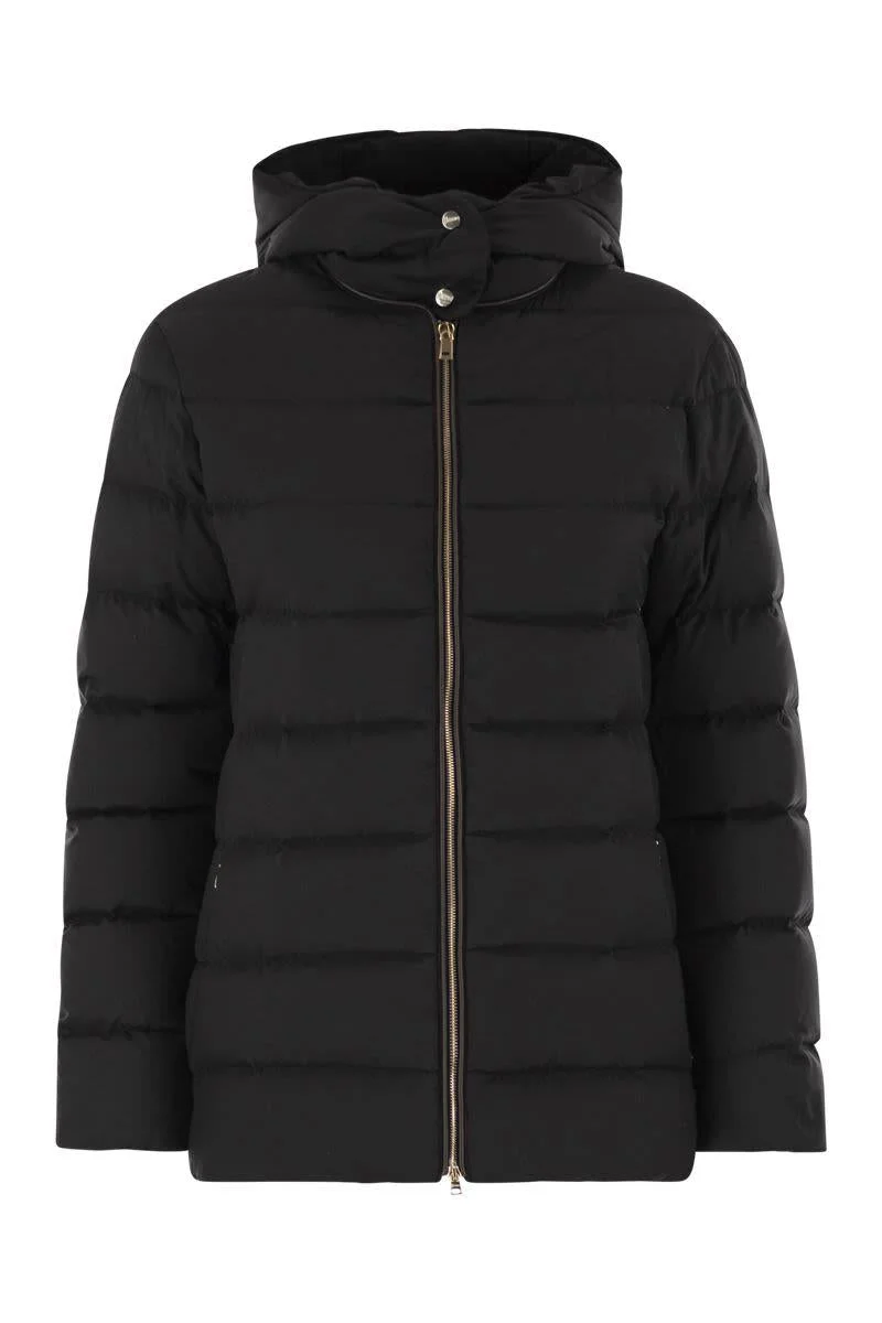 Medium down jacket made from iconic Herno Nylon: an innovative technical fabric that combines good water resistance with a particularly luxurious silk-like feel. A chic and modern leisure wardrobe icon, reinterpreted with fine materials and functional details. The model is enhanced by a high collar with hood and double-slider zip to adjust the fit. - Slim fit - Striped quilting - High collar with hood and snap buttons - Long sleeves - Zipped welt pockets - Metal Herno logo on the back - Double-slider zip closure - Goose down padding - Performance: Water-repellent treatment DESIGNER ID: PI002072D12414Z 9300 Gender: Women Material: 100% POLYESTER LINING: 100% POLYAMIDE TRIMMING: 60% POLYURETHANE, 40% VISCOSE PADDING GOOSE DOWN CLASS 1: 80% DOWN ,20% WATERFOWL FEATHERS Color: Black Made in: Romania Product ID: PI002072D12414Z 9300 *Import tax/duty will be calculated at checkout (If applicable)