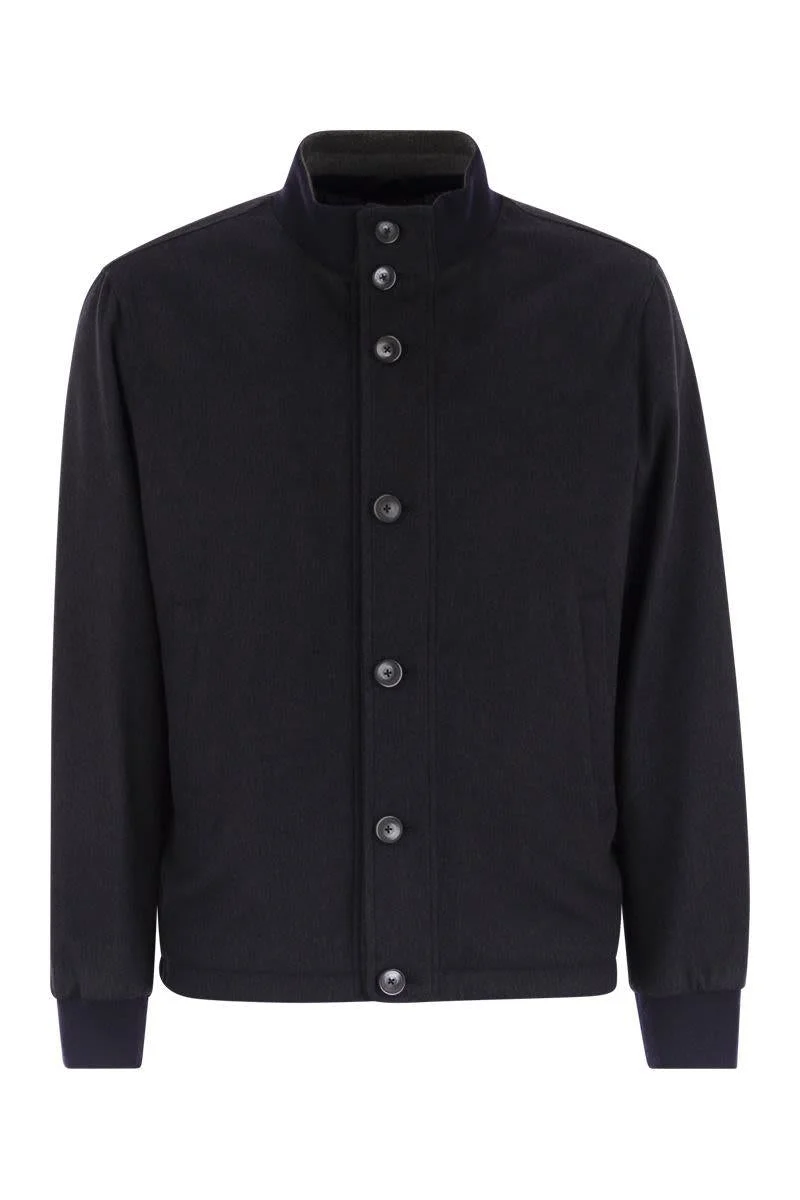 Bomber jacket made from a luxurious blend of silk and cashmere. The model has a sophisticated silhouette with a high collar and classic buttons. It is characterised by its rich appearance and a structured yet fluid feel. - Regular fit - High collar - Side welt pockets - Ribbed edges - Herno metal logo on the back - Button closure DESIGNER ID: GI00076UR38087 9200 Gender: Men Material: 51% SILK, 49% CASHMERE LINING: 100% POLYAMIDE TRIMMING: 44% ACETATE, 44% WOOL, 10% POLYAMIDE, 2% ELASTANE TRIMMING: 90% POLYESTER, 10% ELASTANE COATING: 100% PLYURETHANE PADDING: 100% POLYESTER Color: BLUE Made in: Italy Product ID: GI00076UR38087 9200 *Import tax/duty will be calculated at checkout (If applicable)