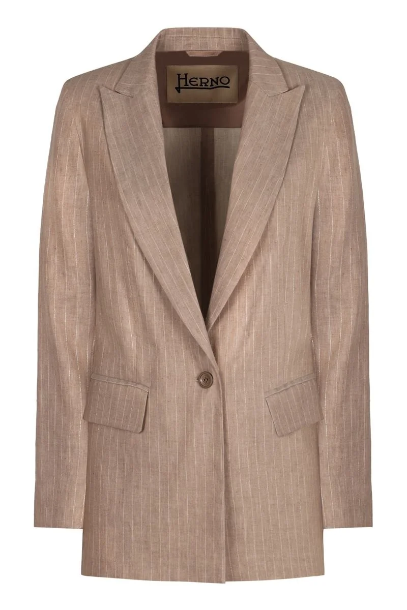 Single-breasted one button jacket Pin-striped motif Peak lapel collar Hem with double back slit 1% Polyamide, 52% Linen, 45% Cotton, 1% Metal, 1% Viscose Gender: Women Material: LINEN Color: Beige Made in: BG Product ID: GA000298D17135_1985 *Import tax/duty will be calculated at checkout (If applicable)