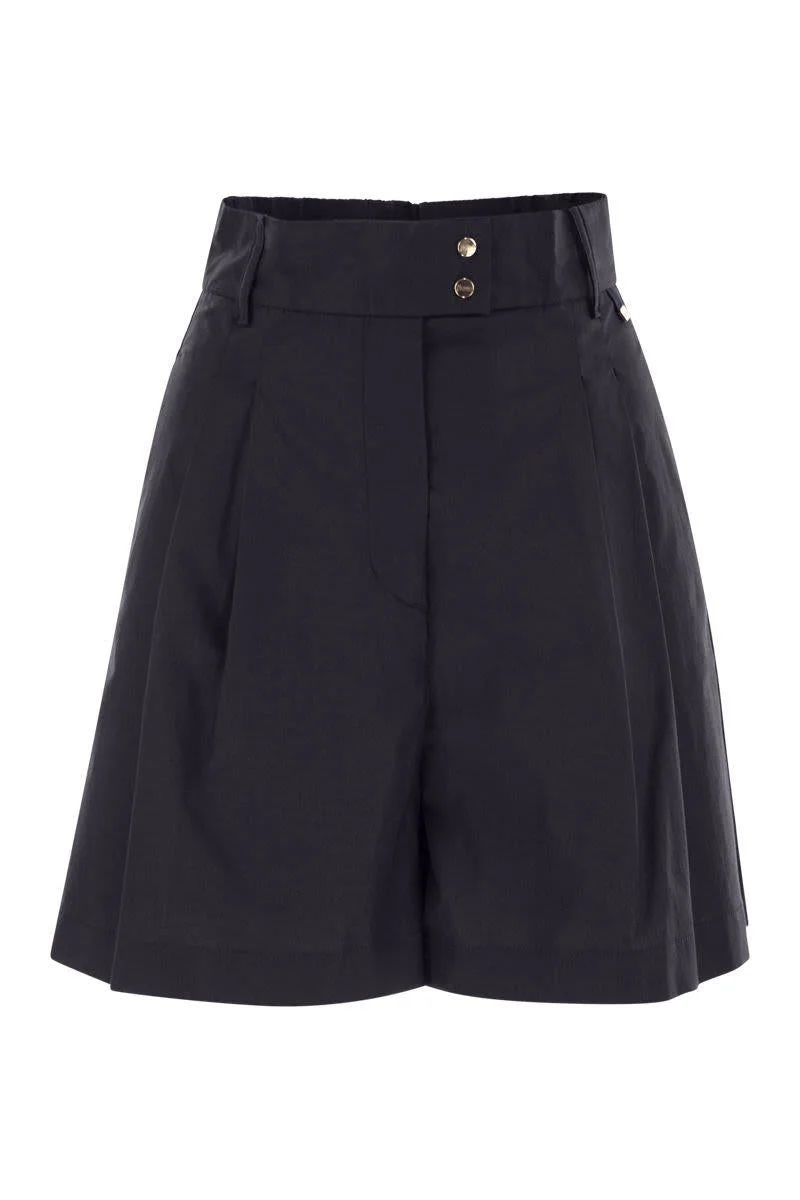 Shorts made of dyed stretch cotton, waterproofed and treated to create a slight ruched effect. The waterproofing process makes the garment perfect to wear on the move and is characterised by a refined line that casually interprets city looks. - Relaxed fit - Elastic insert at waist - Darts - Button and zip fastening - Flat pockets - Welt pockets on the back - Performance: Water-repellent treatment DESIGNER ID: PT000035D13164Z 9200 Gender: Women Material: 96% COTTON, 4% ELASTANE TRIMMING: 55% COTTON 45% POLYESTER Color: BLUE Made in: IT Product ID: PT000035D13164Z 9200 *Import tax/duty will be calculated at checkout (If applicable)