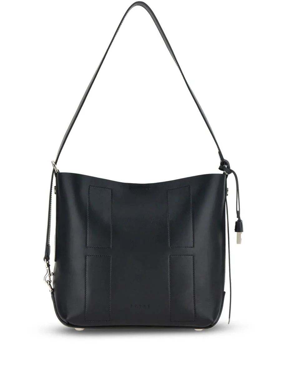 Hogan hobo bag made of smooth black leather. It features silver-tone hardware, an internal magnetic button closure and an adjustable shoulder strap with a side hook. The interior, lined with brown suede, includes a matching pouch. The design is completed by metal protective feet, a H charm pendant and the iconic logo embossed on the front. Gender: Women Material: 100% CALFSKIN Color: Black Made in: IT Product ID: KBW01RS0200TZPB999 *Import tax/duty will be calculated at checkout (If applicable)