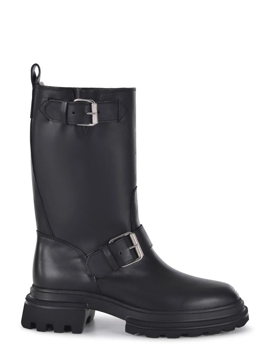 Biker boots Hogan "10-Storey" made of smooth leather in Black. Silver metal buckle detail. Soft insole. Extralight EVA sole with two islands. Soft insole 5cm Total height 5.5cm Sole Gender: WOMEN Material: LEATHER Color: Black Made in: Imported Product ID: HXW6740FM10TQ1B999 *Import tax/duty will be calculated at checkout (If applicable)