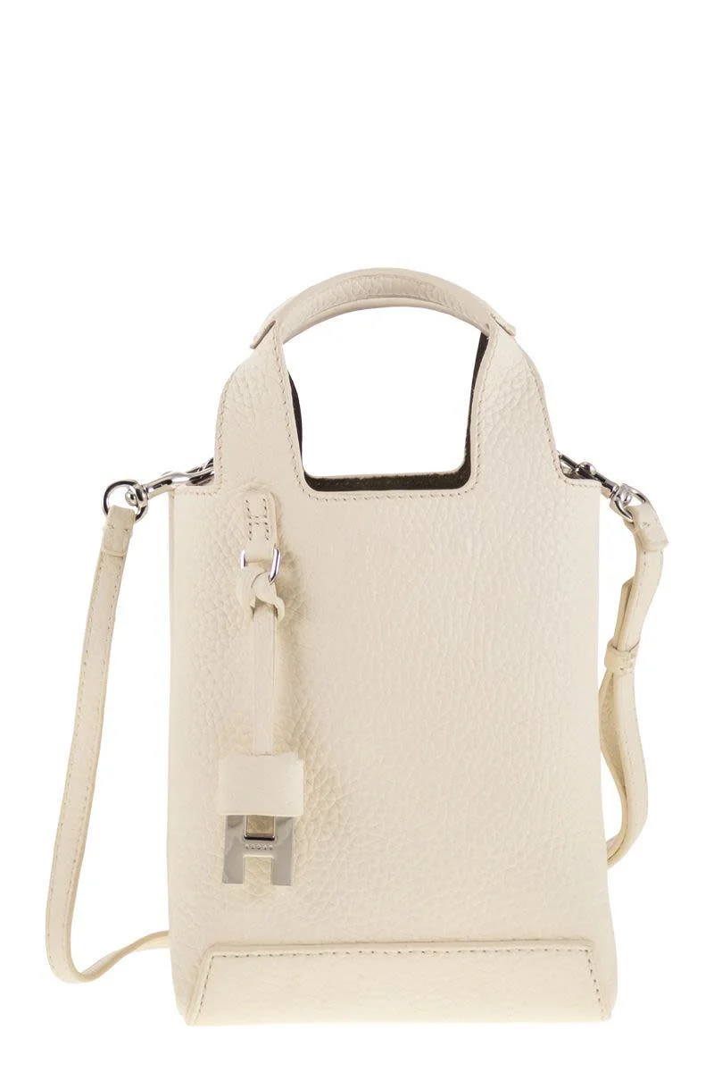 Made from hammered leather, this unlined mini bag has two handles for carrying by hand and a removable shoulder strap. The interior is divided into two compartments, separated by a flat pocket with card slots. A chic and functional model, with the Hogan logo embossed and an H-Fob charm in metal. - Mini Hogan women's shopping bag - Made from hammered leather - Embossed Hogan logo - Coated metal H-Fob charm - Central pocket with card holder - Dimensions: 16 x 18 x 9 cm - Double handles - Adjustable and removable shoulder strap - Fabric pouch included DESIGNER ID: KBW01RA0100TH1B013 Measures: W 16 x H 18 x D 9 cm Gender: Women Material: GRAINED LEATHER Color: Beige Made in: Imported Product ID: KBW01RA0100TH1B013 *Import tax/duty will be calculated at checkout (If applicable)