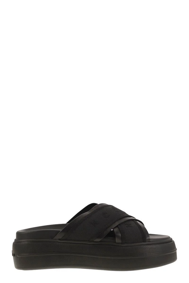 Featuring a high light sole, the Hogan Skyscraper platform sandals have two cross-over nappa leather straps, enriched with a grosgrain ribbon with jacquard logo. Functional and versatile, they express a contemporary style with an urban chic vibe. - Hogan Skyscraper women's sandals - Made in Italy - Nappa leather upper - Fabric inserts - Hogan jacquard logo - Anatomical leather-covered insole - EVA sole - Fabric pouch included DESIGNER ID: HXW6800FO10LE9B999 Measures: Total height: 6 cm Gender: Women Material: UPPER: NAPPA AND TEXTILE FIBERS LINING: LEATHER SOLE: EVA Color: Black Made in: IT Product ID: HXW6800FO10LE9B999 *Import tax/duty will be calculated at checkout (If applicable)
