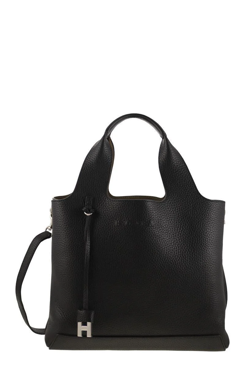 Made from hammered leather, this unlined bag has two handles for carrying by hand and a removable shoulder strap. The spacious interior is divided into two compartments, separated by a flat pocket with a zip. A chic and functional model, with the Hogan logo embossed and a metal H-Fob charm. - Hogan women's shopping bag - Item made from hammered leather - Embossed Hogan logo - Coated metal H-Fob charm - Central pocket with zip closure - Double handles - Adjustable and removable shoulder strap - Care and maintenance instructions included - Fabric dust bag included DESIGNER ID: KBW01RA0200TH1B999 Measures: W 34 x H 22.5 x D 15 cm Gender: Women Material: GRAINED LEATHER Color: Black Made in: Imported Product ID: KBW01RA0200TH1B999 *Import tax/duty will be calculated at checkout (If applicable)