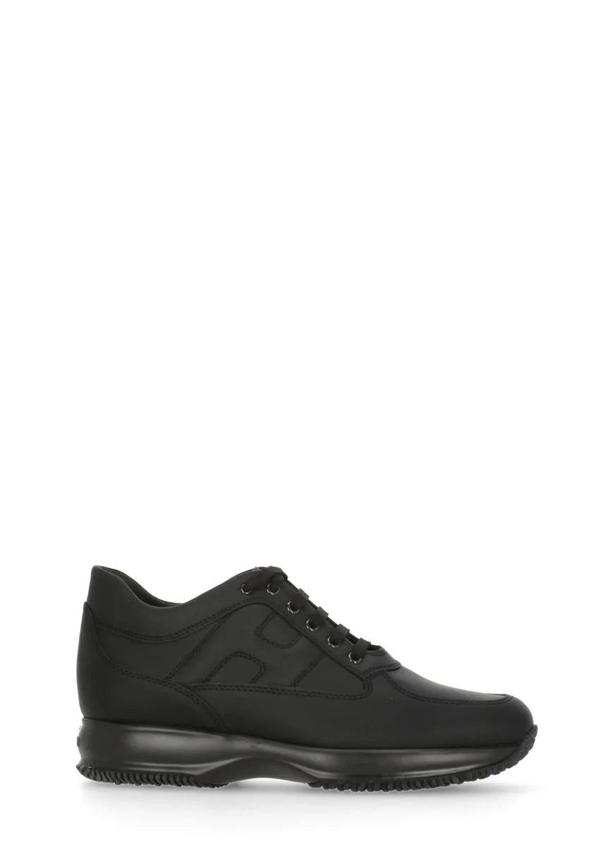 - Black Hogan smooth leather sneakers for man - Round toe - Logoed tongue - Laces fastening - Side tone on tone iconic H - Raised rubber sole (4 cm) Shoe runs true to size Gender: MEN Material: 100% CALF LEATHER SOLE: 100% RUBBER Color: Black Made in: IT Product ID: HXM00N00010KLAB999 *Import tax/duty will be calculated at checkout (If applicable)