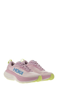 The ultra-damp revolution. One of the most durable shoes in the HOKA line, the Bondi has evolved dramatically this season: it has been reworked with softer, lighter foams and an all-new geometry with an expanded heel. With a ripple effect, the shock-absorbing cushioning at the rear ensures an incredibly soft and balanced wearing experience, from heel strike to forefoot transition. - Suitable for road and walking - Technical mesh construction - Partially gusseted tongue - Recycled polyester sockliner (40%) - Heel puller - Ortholite® hybrid insole - Lightweight, resilient foam - Zoned rubber positioning to save weight - Durabrasion Rubber outsole - Vegan model - Recycled polyester mesh upper (50%) - Recycled polyester strobel footbed (87%) - Recycled polyester sockliner upper (100%) - Additional laces in the box DESIGNER ID: 1127952 PTWL Measures: Sole height: 5 cm Gender: Women Material: UPPER: RECYCLED POLYESTER MESH AND TECHNICAL MESH LINING: RECYCLED POLYESTER SOLE: DURABRASION RUBBER Color: PINK Made in: VN Product ID: 1127952 PTWL *Import tax/duty will be calculated at checkout (If applicable)