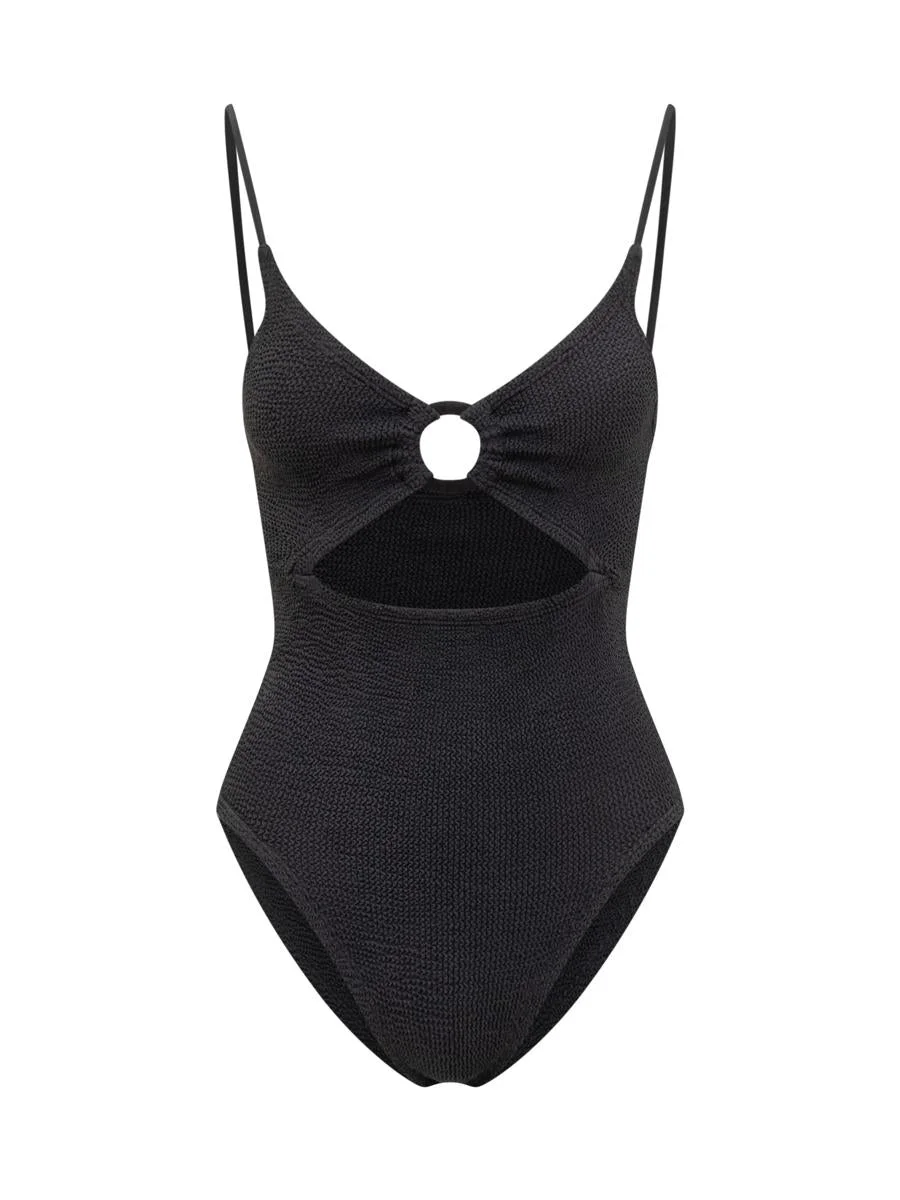 Without padding. U-shaped neckline. Braided shoulder straps. Cut-out detail with ring at bust. High-waisted briefs with moderate cleavage. Made from crinkle stretch fabric. Gender: Women Material: 97% POLYAMIDE, 3% ELASTANE Color: Black Made in: Imported Product ID: SCRYSTALCR BLACK *Import tax/duty will be calculated at checkout (If applicable)