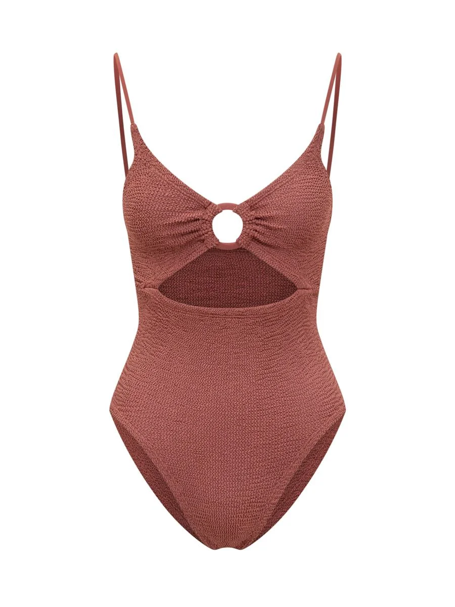 Without padding. U-shaped neckline. Braided shoulder straps. Cut-out detail with ring at bust. High-waisted briefs with moderate cleavage. Made from crinkle stretch fabric. Gender: Women Material: 97% POLYAMIDE, 3% ELASTANE Color: BROWN Made in: Imported Product ID: SCRYSTALCR ROSEWOOD *Import tax/duty will be calculated at checkout (If applicable)