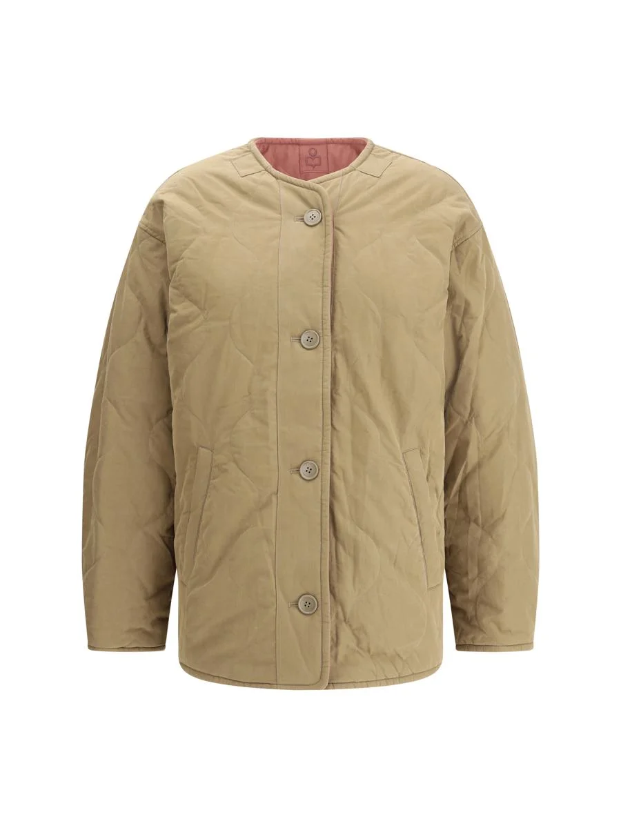 ISABEL MARANT ETOILE'S NESMAE REVERSIBLE COAT COMBINES FUNCTIONALITY AND CONTEMPORARY STYLE IN A VERSATILE GARMENT. MADE OF PADDED AND QUILTED POLYESTER TAFFETA, IT CAN BE WORN ON THE MAIN SIDE OR ON THE BACK IN BROWN TAFFETA FOR A COMPLETELY DIFFERENT EFFECT. THE ROUND NECK, BUTTON CLOSURE AND FRONT WELT POCKETS PROVIDE PRACTICALITY, WHILE THE EMBROIDERED LOGO ON THE BACK OF THE NECK ADDS A DISTINCTIVE DETAIL. INTERIOR WELT POCKETS COMPLETE THE DESIGN, PERFECT FOR STORING SMALL ITEMS. RTW FR Gender: Women Material: POLYESTER | POLYESTER Color: BROWN Made in: Imported Product ID: MA0251FAC3G01E_67KI *Import tax/duty will be calculated at checkout (If applicable)