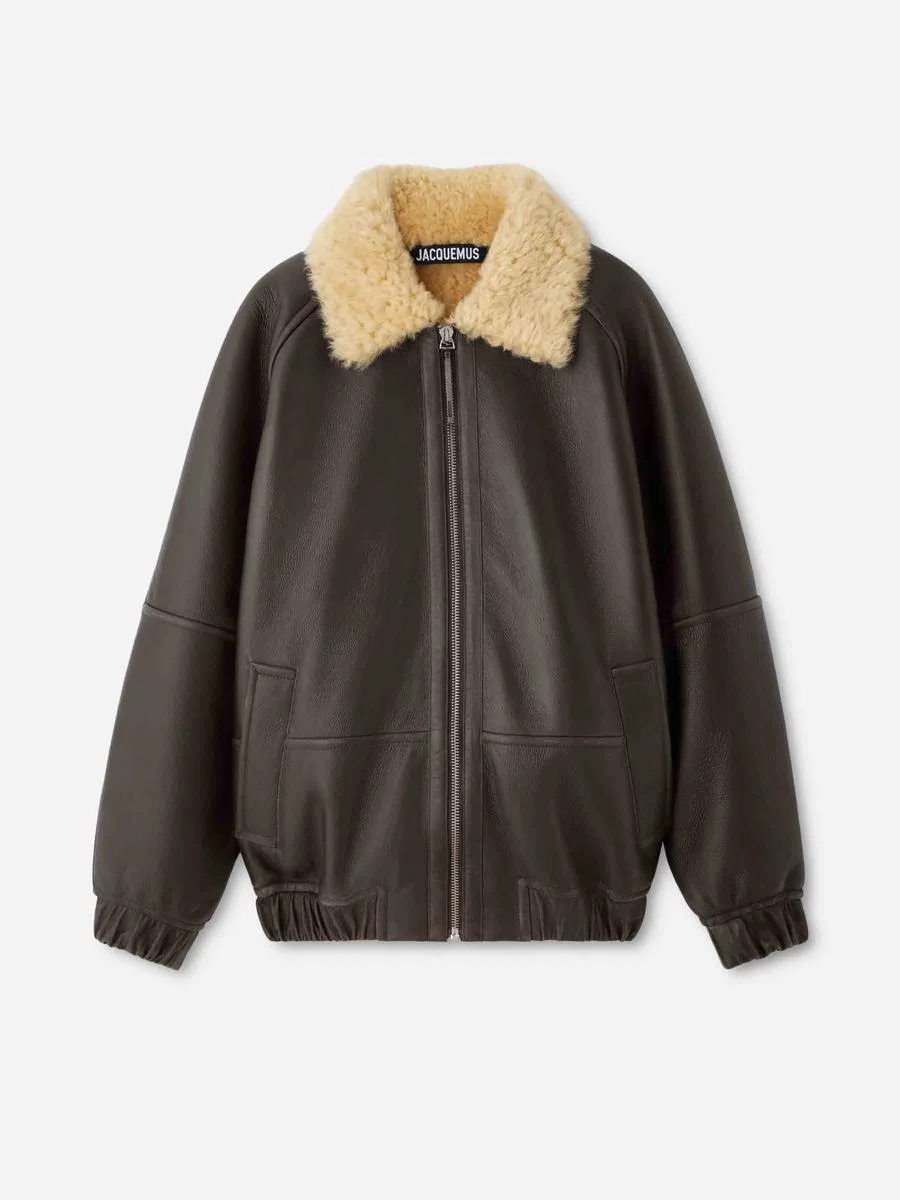 Bombay JacketAviator jacket By Jacquemus• Large piped pockets• Raglan sleeve with elastic cuffs and fitted elastic hem• Made of double-faced sheepskin• Aviator jacket• Zipper closure with long leather pull• Contrast fur pointed collarComposition: 100% lambskinTurkey Gender: Men Material: 100% LAMBSKIN Color: Brown Made in: Imported Product ID: 25HOUM00128AC16L05_880DARK BROWN *Import tax/duty will be calculated at checkout (If applicable)