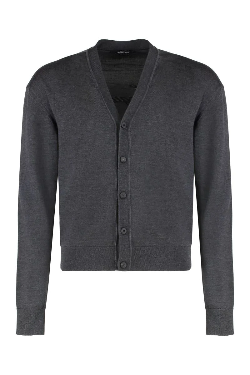 Cardigan made of merino wool This cardigan has a gray tone. The design features a classic V-neck and a front button closure. It has ribbed edges and an embroidered logo on the back. Made from a soft and comfortable fabric, it is perfect for cooler days. The clean lines and versatile fit make it easy to match with different outfits. 96% Wool, 4% Polyester Gender: Men Material: WOOL Color: GREY Made in: Portugal Product ID: 25HCDM00577AK00299_970 *Import tax/duty will be calculated at checkout (If applicable)