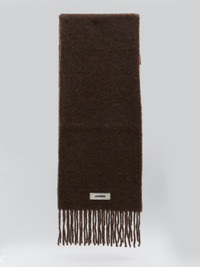 Scarf in brown mohair and alpaca blend. Features fringed ends and an embroidered logo. Dimensions: 251 x 40 cm Size nationality: UNI Gender: Women Material: 28% MOHAIR, 28% ALPACA, 24% WOOL, 20% POLYAMIDE Color: BROWN Made in: Italy Product ID: 1525185 ACU00572BOT 4032 850 *Import tax/duty will be calculated at checkout (If applicable)