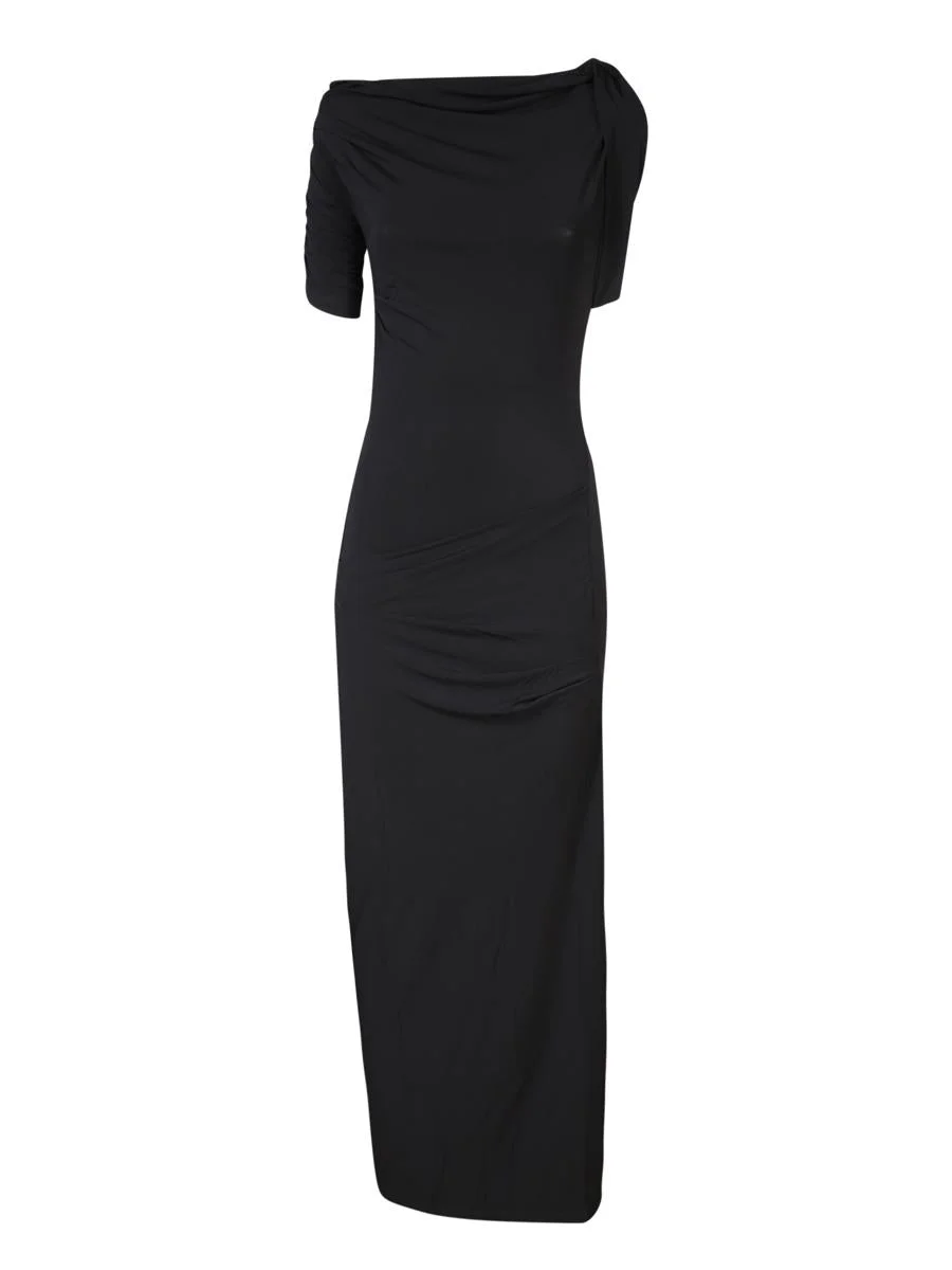 Short-sleeved black viscose midi dress. Draped design with asymmetrical neckline.. This black midi dress from Jacquemus blends elegance with a modern twist. Featuring sophisticated draping and an asymmetrical line, it is perfect for formal evenings or special events Gender: Women Material: 71% VISCOSE 21% POLYESTER 8% ELASTANE Color: Black Made in: Imported Product ID: 241DR144 2381 990 *Import tax/duty will be calculated at checkout (If applicable)