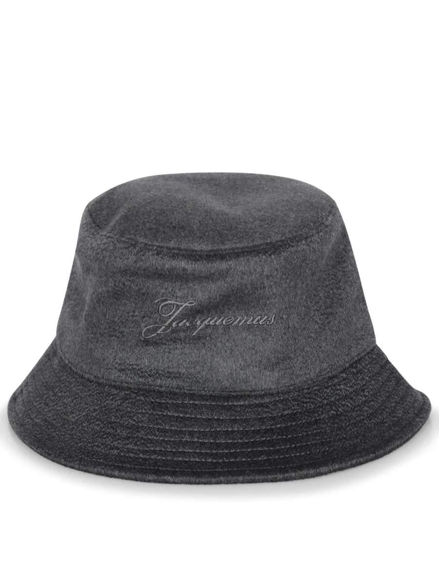 Grey cashmere fabric hat. Embroidered logo detail on the front. Crafted in soft grey cashmere, this Jacquemus hat is enhanced with an elegant embroidered logo on the front, perfect for a sophisticated and contemporary look. Gender: Women Material: 100% COTTON 100% WOOL Color: GREY Made in: Imported Product ID: ACU00778 AW00701 970 *Import tax/duty will be calculated at checkout (If applicable)