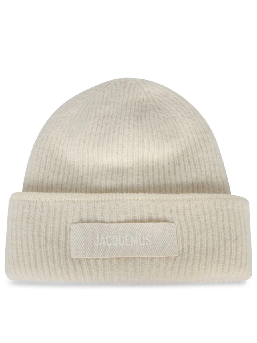 Ribbed knit hat. Gros grain fabric. Front JACQUEMUS logo. This elegant Jacquemus hat, made from soft white gros grain fabric, stands out with its minimalist design enhanced by a discreet logo on the front. Perfect for a stylish touch on colder days. Gender: Women Material: 49% ALPACA 30% POLYAMIDE 21% WOOL Color: WHITE Made in: Imported Product ID: ACU00666 AK00227 110 *Import tax/duty will be calculated at checkout (If applicable)