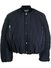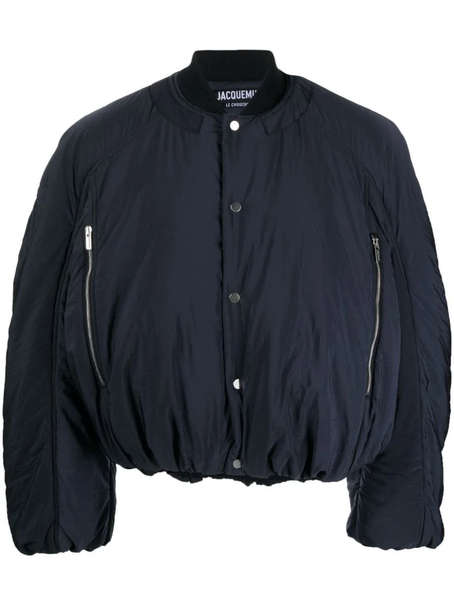 Croissant puffer bomber jacket from Jacquemus featuring navy blue, white, padded design, ribbed band collar, front press-stud fastening, two side zip-fastening pockets, sleeve zip pocket, long sleeves, elasticated hem, elasticated cuffs, grosgrain logo ribbon at the rear and fully lined. Gender: Men Material: POLYAMIDE100% Color: BLUE Made in: FR Product ID: 236BL044-1320 390 *Import tax/duty will be calculated at checkout (If applicable)