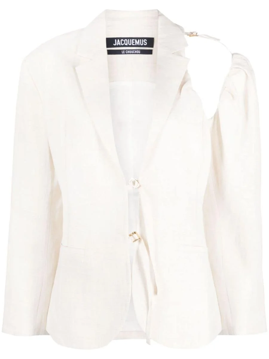 La veste Galliga asymmetric blazer from Jacquemus featuring off-white, linen blend, notched lapels, cut-out detailing, long sleeves, gold-tone hardware, two side welt pockets, buttoned central rear vent, adjustable attached strap and adjustable D-ring fasteners. This item contains at least 50% materials which are certified or widely recognised as having a lower environmental impact through production and/or manufacturing processes that reduce water consumption and the use of harmful chemicals, or re-use by-products of the production process.. Learn more about what makes a product Conscious on our Conscious Criteria page. This piece fits true to size. We recommend you get your regular size Model is 1,75m / 5ft 8in wearing size 36 (FR) Gender: Women Material: OUTER: LINEN/FLAX 60%, VISCOSE 26%, POLYESTER 14% LINING: COTTON 48%, ACETATE 47%, SPANDEX/ELASTANE 5% Color: WHITE Made in: PT Product ID: 233JA0401069OFFWHITE *Import tax/duty will be calculated at checkout (If applicable)