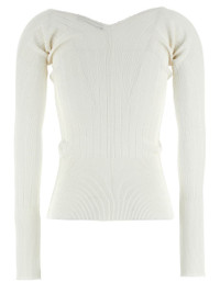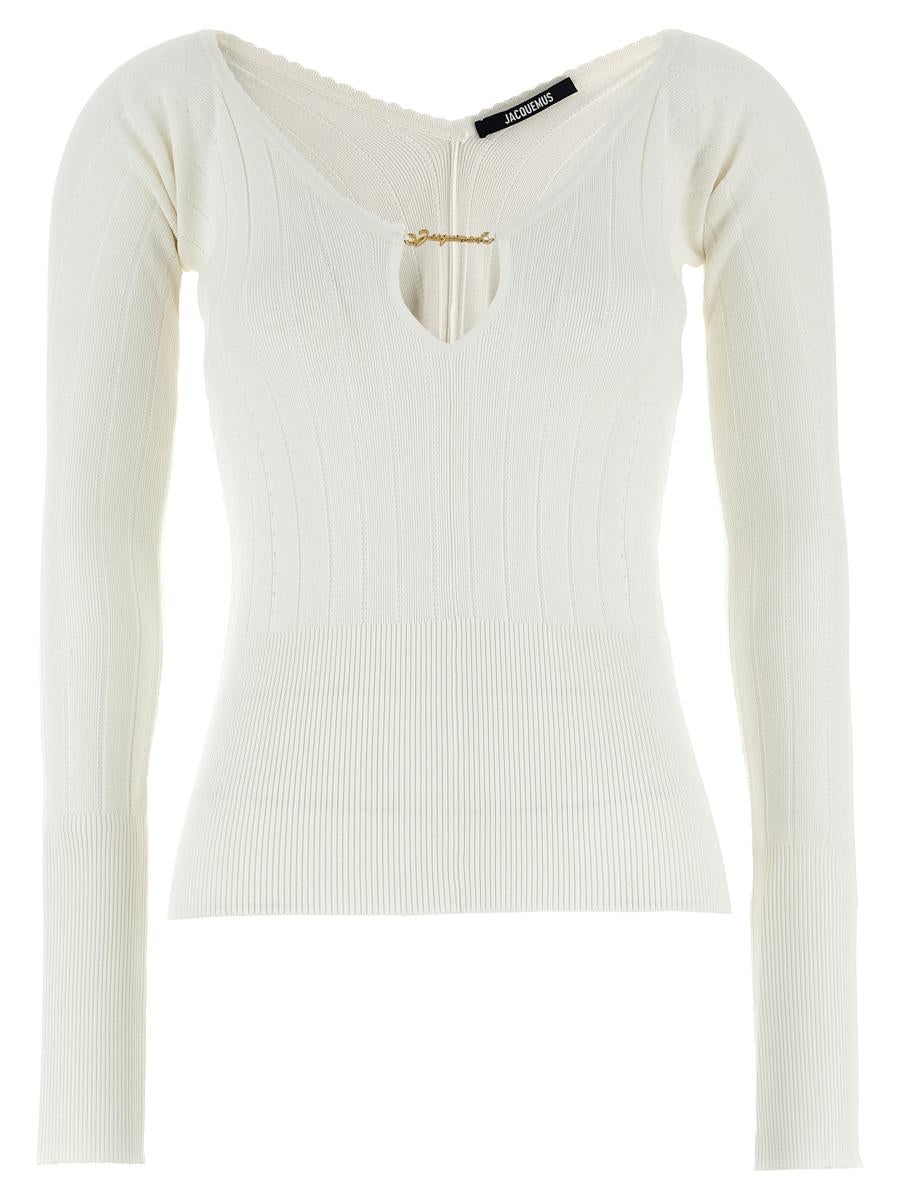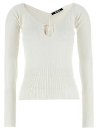 'Le haut Pralù' ribbed stretch viscose top, front cut-out detail with gold metal logo charm, long sleeves Gender: Women Material: 94% VISCOSE 6% POLYESTER Color: WHITE Made in: RO Product ID: 24E241KN3572358110 *Import tax/duty will be calculated at checkout (If applicable)