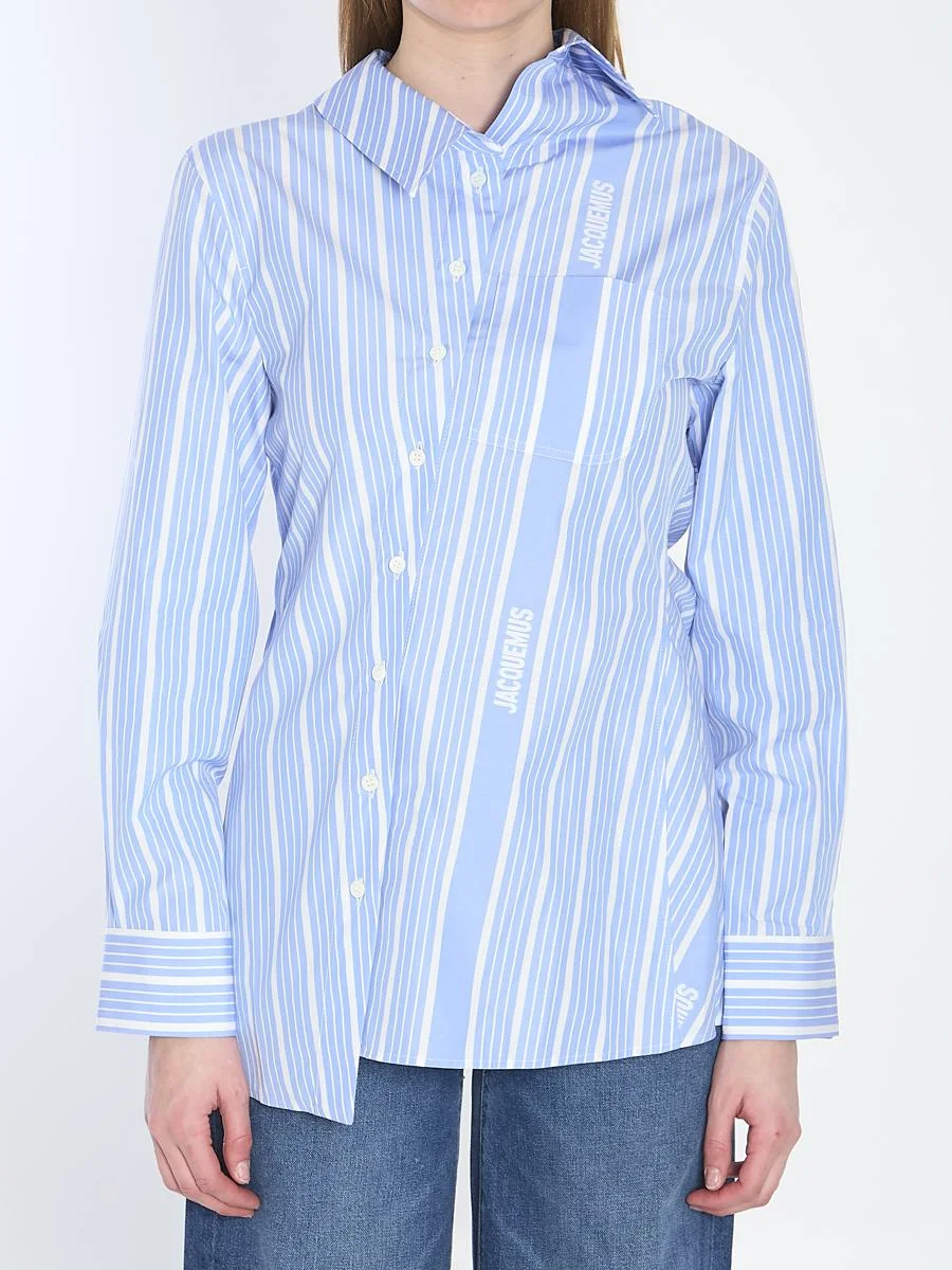 Pablo shirt in light blue cotton poplin with white stripes and white logos. It features an asymmetric pointed collar with asymmetric button closure, a "J"-shaped chest pocket, cufflinks with buttons, a rear yoke with a "J" loop, and an asymmetric hem. The model is 178cm tall and wears a size FR 38. Size nationality: FR Gender: Women Material: 100% COTTON Color: BLUE Made in: BG Product ID: 3166766 243SH062 1691 3EV *Import tax/duty will be calculated at checkout (If applicable)