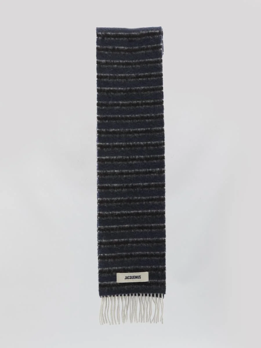 Scarf in alpaca, virgin wool, and nylon. Features a striped pattern in blue and dark gray, fringed ends, and an applied logo. Dimensions: 200 x 21 cm Size nationality: UNI Gender: Men Material: 58% ALPACA, 27% VIRGIN WOOL, 15% POLYAMIDE Color: BLUE Made in: Italy Product ID: 6320041 ACU00774 AK00289 3ER *Import tax/duty will be calculated at checkout (If applicable)