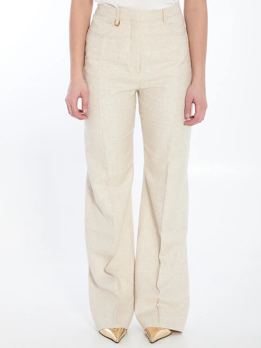 Sauge trousers in a stretch beige viscose and linen blend. They feature a high waist, hook, button, and zip closure, a "J" belt loop, a gold-tone metal detail on the front, two side pockets, soft pleats on the legs, and a flared cut. The model is 178cm tall and wears a size FR 38. Size nationality: FR Gender: Women Material: 70% VISCOSE, 30% LINEN; DETAIL: COTTON, ELASTANE Color: Beige Made in: BG Product ID: 3588245 243PA003 1358 130 *Import tax/duty will be calculated at checkout (If applicable)