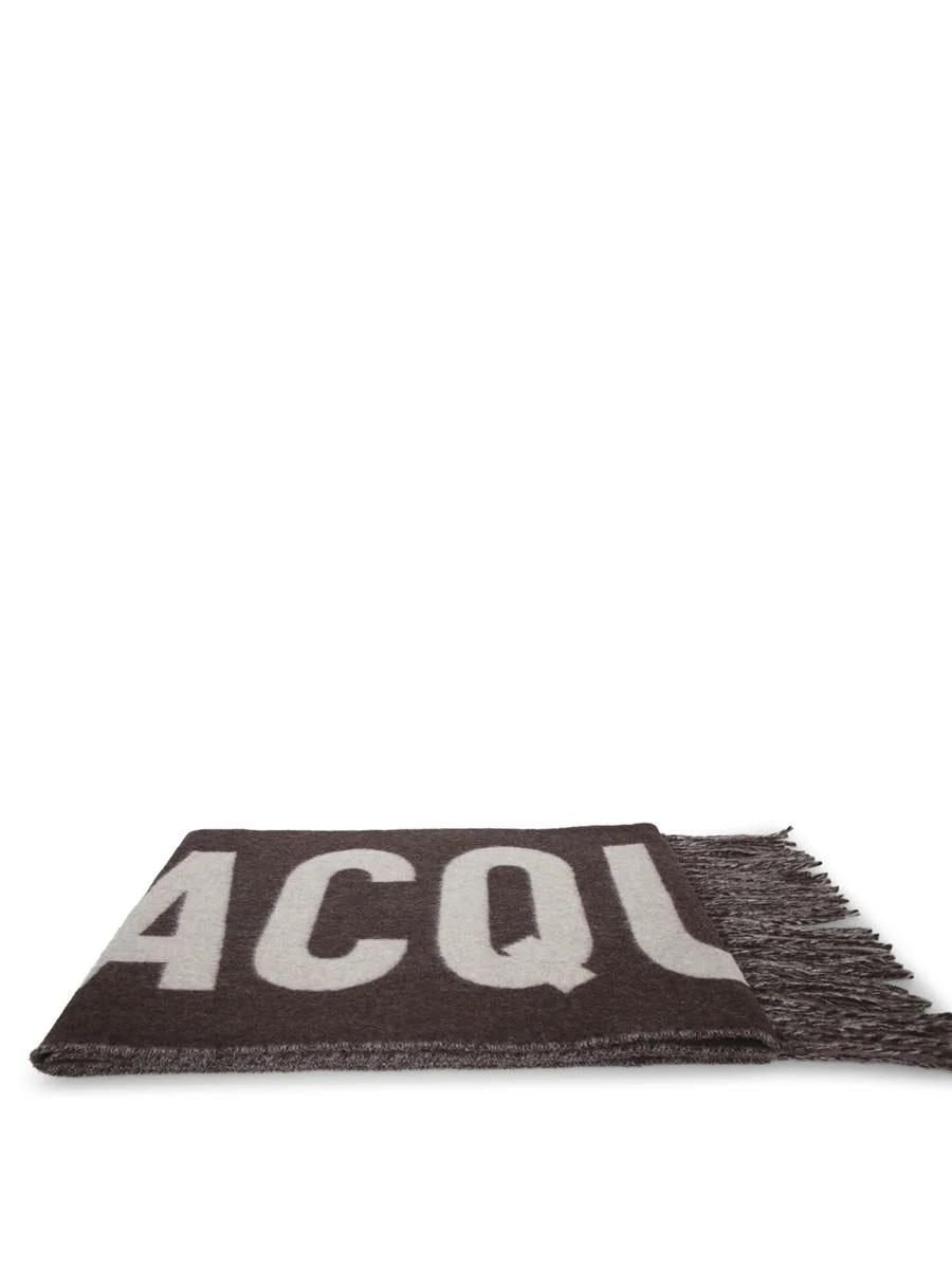 Wool scarf with fringes. Contrast logo design. Wrap-around style.. This brown wool Jacquemus scarf stands out with its large contrasting white 'ACQU' logo. The wrap-around design and fringed ends add a touch of sophisticated and functional style Gender: Women Material: 100% WOOL Color: BROWN Made in: Imported Product ID: ACU00435 AOT4001 080 *Import tax/duty will be calculated at checkout (If applicable)