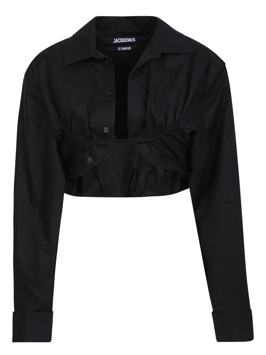 Jacquemus' unmistakable signature is evident in this top with gathered details and crop cut Spread collar. Long sleeves. Strap fastening. Ruched detail. Cropped. Curved hem. Color: black Material: 100% Cotton Product code: 181559 Brand code: 223SH014 1064 990 Gender: Women Material: 100% COTTON Color: Black Made in: Imported Product ID: 223SH014 1064 990 *Import tax/duty will be calculated at checkout (If applicable)
