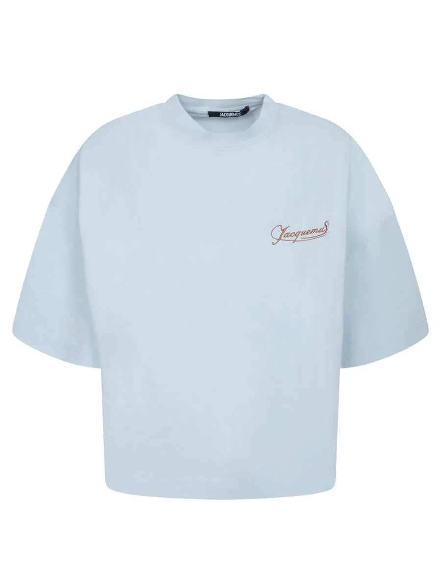 Short sleeves, crew neck, embroidered logo. This Jacquemus cropped T-shirt in a delicate light blue shade is minimalist in design yet rich in style. The embroidered logo on the chest adds a distinctive touch. Gender: Women Material: 100% COTTON Color: BLUE Made in: Imported Product ID: TSW00216 AJ00045 UNI CLUB *Import tax/duty will be calculated at checkout (If applicable)