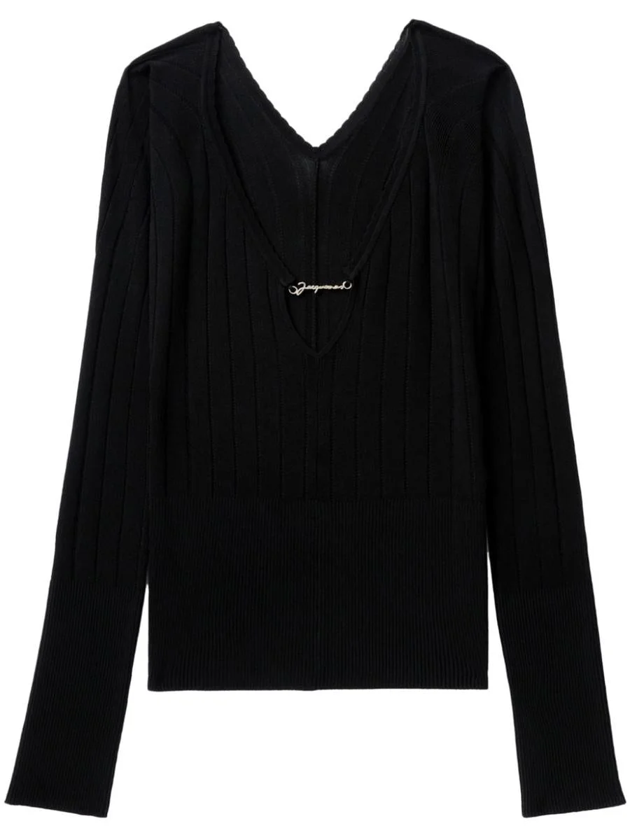 Black ribbed knit scallop edge to the neck gold-tone logo plaque to the front keyhole neck long sleeves ribbed cuffs and hem straight hem unlined LENGTH: 140.0 Centimetres WIDTH: 140.0 Centimetres Gender: Women Material: 94% VISCOSE 6% POLYESTER Color: BLACK Made in: ROUMANIE Product ID: 241KN3572358990 *Import tax/duty will be calculated at checkout (If applicable)