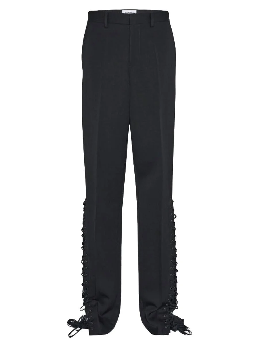 black wool interlock twill weave belt loops pressed crease hook and zip fly fastening straight leg side lace-up fastening two side slit pockets two rear welt pockets This piece fits true to size. We recommend you get your regular size Model is 1,75m / 5ft 8in wearing size 36 (FR) Gender: Women Material: LINING: 100% VISCOSE EXTERIOR: 100% WOOL Color: Black Made in: IT Product ID: PA021IC04200 *Import tax/duty will be calculated at checkout (If applicable)