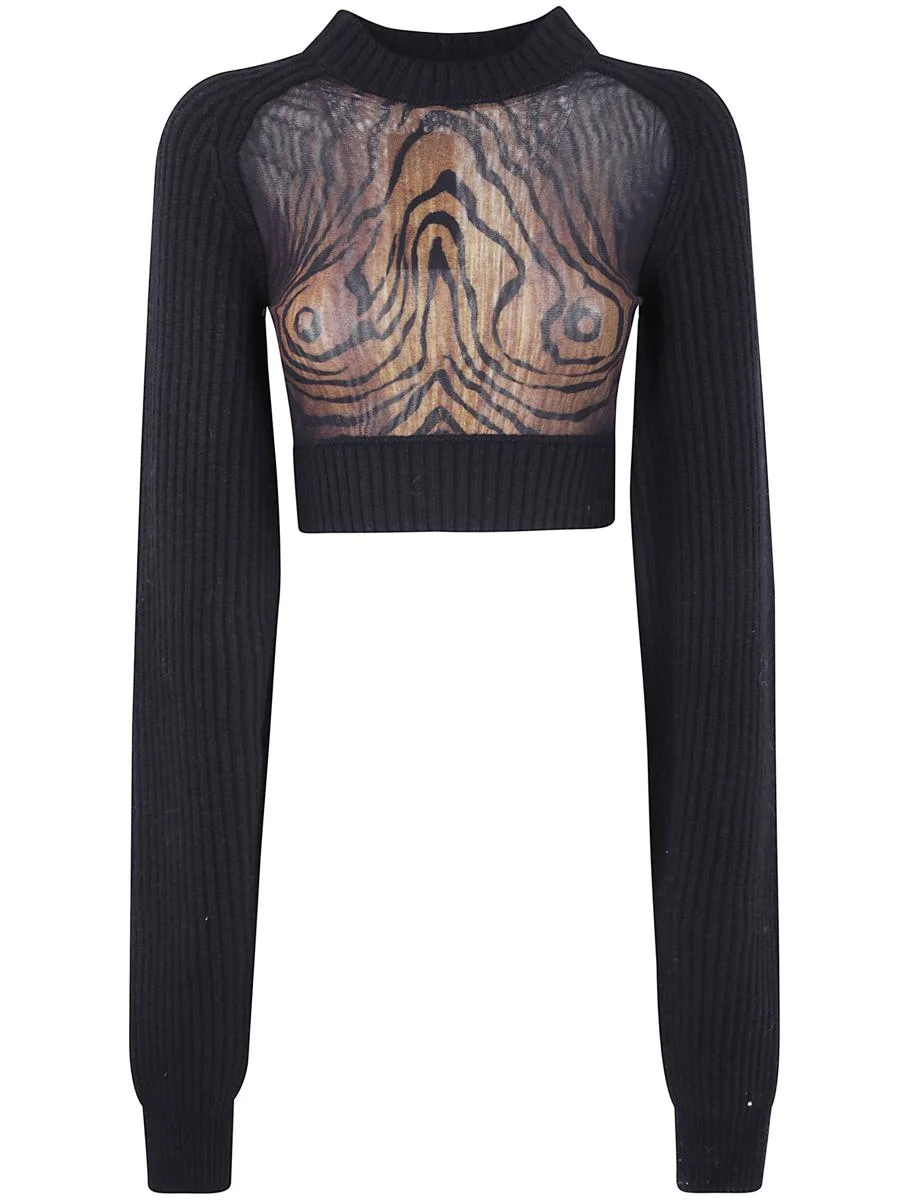 Jean Paul Gaultier Lambswool Ribbed Long Sleeves Cropped Sweater With Printed Mesh Cut Out Details C