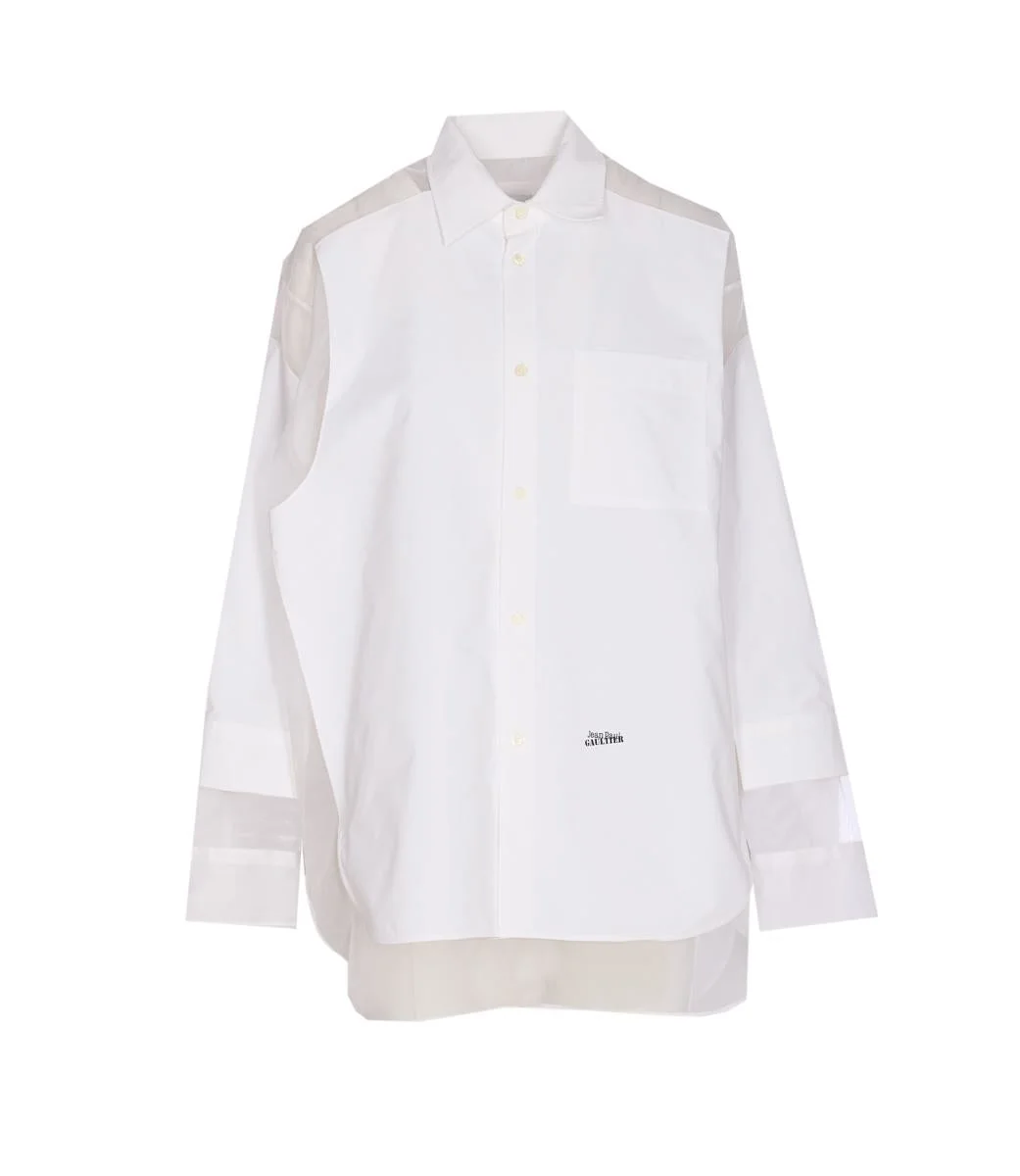 Jean Paul Gaultier White Petit Grand Shirt With Frontal Buttons Closure, Regular Collar, Long Sleeves, Transparent Effect, Buttons On Cuffs, One Pocket, Print Logo On The Front, US SIZE Gender: Women Material: 100% SILK, 100% POLYAMIDE Color: WHITE Made in: Portugal Product ID: ST035C07501 *Import tax/duty will be calculated at checkout (If applicable)