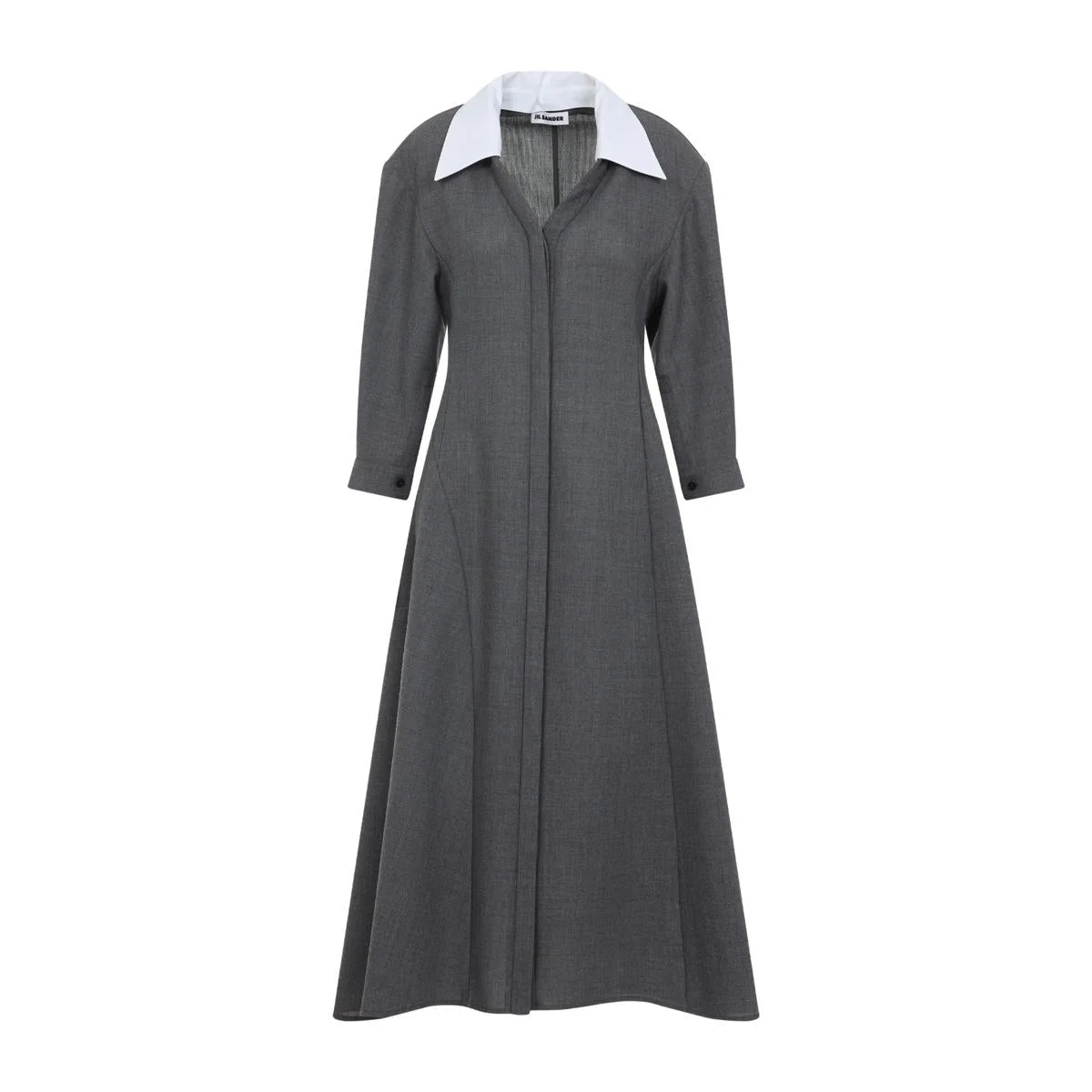 Jil Sander 230 MF Grey Wool Midi Dress. Crafted from grey wool canvas, detachable white contrasting pointed collar, v-neckline, front concealed button fastening, fitted bodice, dropped shoulders, three-quarter sleeves buttoned cuffs, flared skirt, above-the-knee length. Gender: Women Material: 100%WOOL Color: GREY Made in: Italy Product ID: J02CT0522.J41557_030 *Import tax/duty will be calculated at checkout (If applicable)