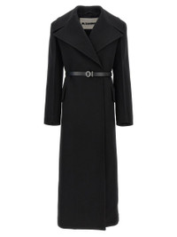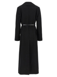 Compact wool double-breasted coat with button closure, pockets, padded shoulders, long sleeves, back split, leather belt to tie at the waist Gender: Women Material: 100% WOOL Color: Black Made in: IT Product ID: J02AA0140J40178001 *Import tax/duty will be calculated at checkout (If applicable)