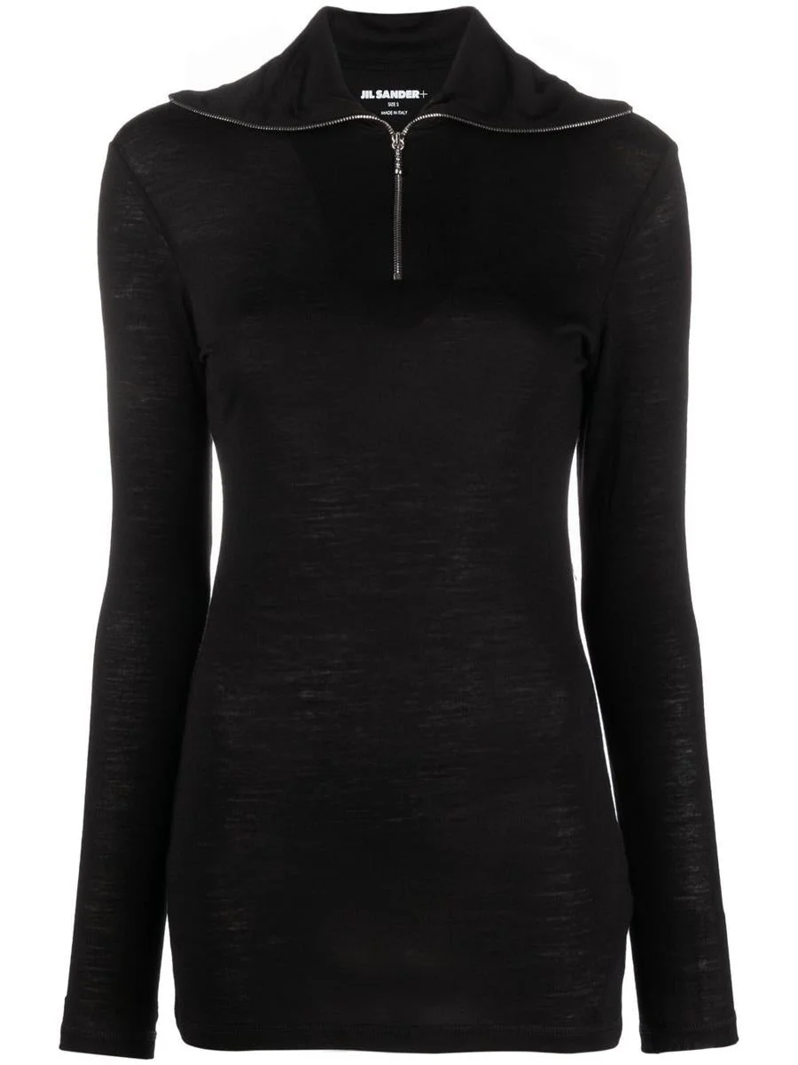 Jil Sander's black long-sleeved top in fine knit with a short front zip and logo Gender: Women Material: .55% POLYESTER 45% VIRGIN WOOL Color: Black Made in: Italy Product ID: J40GC0021 J70021 001 *Import tax/duty will be calculated at checkout (If applicable)