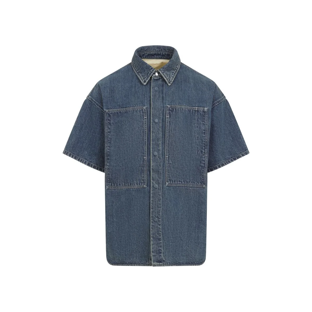 Jil Sander+ 168 Cotton Shirt. Crafted from bleached blue cotton denim, selvedge cut, pointed collar, front concealed snap button fastening, tri front patch pockets, dropped shoulders, short sleeves, back yoke and boxy pleat, branded leather label at the back, round hem, oversize fit. Gender: Men Material: 100%COTTON Color: BLUE Made in: IT Product ID: J47DL0168.J45291_420 *Import tax/duty will be calculated at checkout (If applicable)
