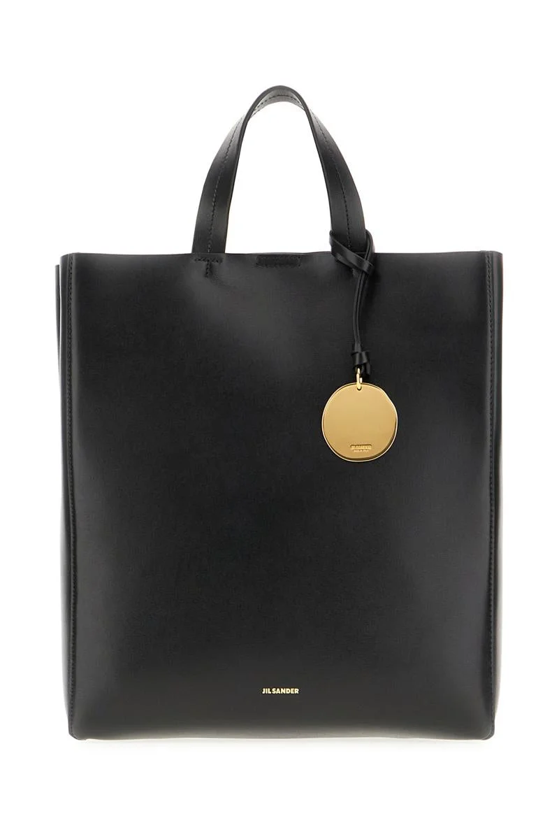 Black leather tote bag. Two top handles. Adjustable and removable shoulder strap. Magnetic button closure. Gold medallion detail on front. Logo on front. Width: 26 Height: 29.5 Depth: 8.5 Gender: WOMEN Material: OUTSIDE: 100% CALF EATHER Color: Black Made in: IT Product ID: J07WD0090P4840 001 *Import tax/duty will be calculated at checkout (If applicable)